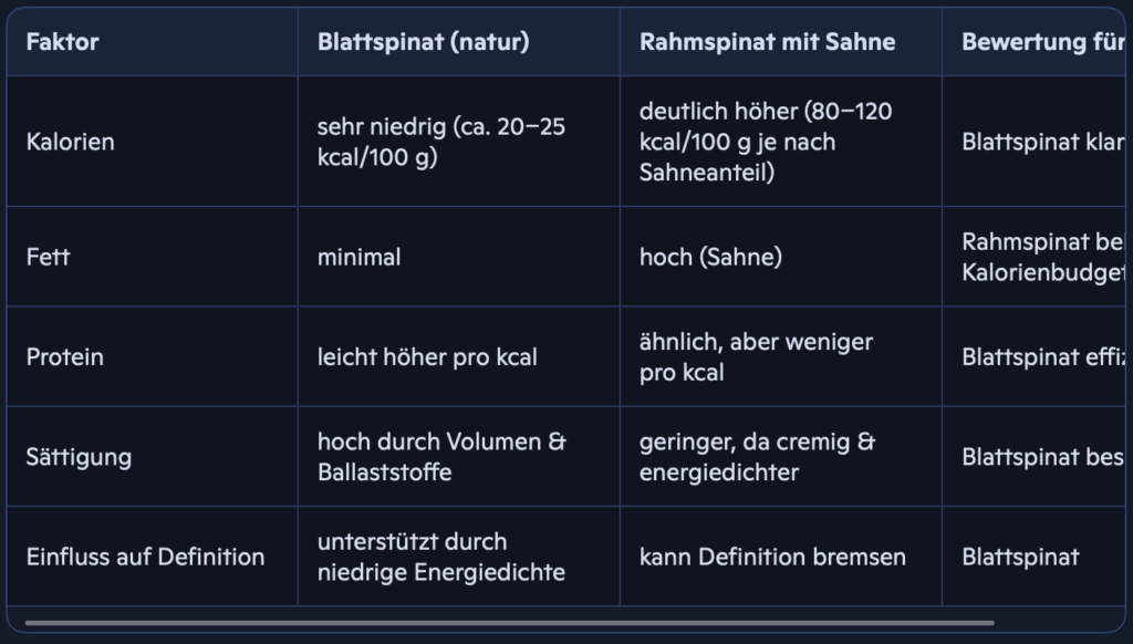 Hier kommt eine klare, datenorientierte Gegenüberstellung von Blattspinat vs. Rahmspinat mit Sahne – genau auf deine Ziele zugeschnitten: Figur, Workout-Performance, Gesundheit.