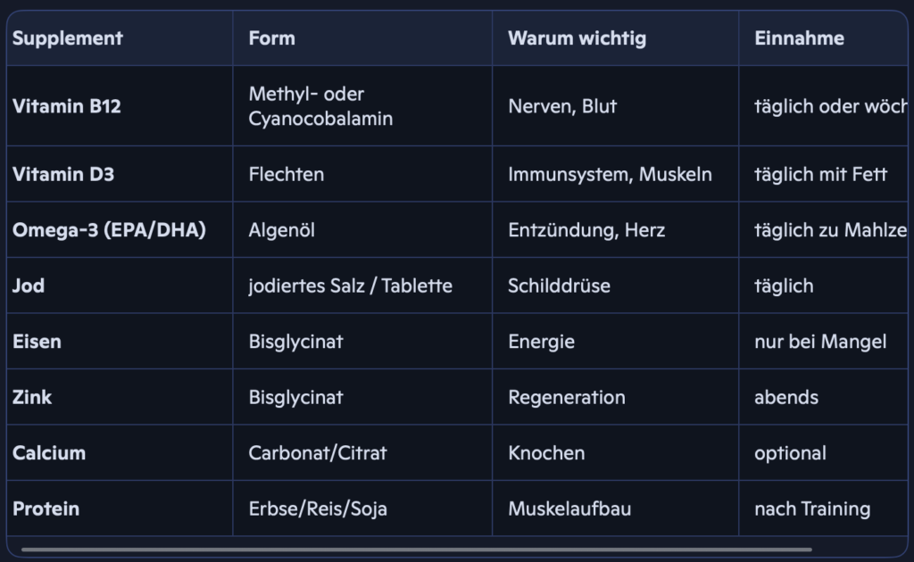 hier kommt die strukturierte, medizinisch sinnvolle Übersicht über die wichtigsten Supplemente in einer veganen Bodybuilding‑Ernährung, inklusive Form, Funktion und Integration in deinen Tagesablauf.